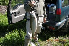 Lokatölur 2011 Karl Lúðvíksson skrifar 28. október 2011 10:55 Lax þreyttur í Breiðdalsá, en hún fór í nýtt met á liðnu sumri. Þá eru lokatölur komnar úr flestum ánum en þó vantar ennþá lokatölur úr Ytri Rangá enda veiði ekki hætt þar fyrr en um helgina. Það sem stendur svo sem uppúr þessu sumri, sem er það fjórða besta frá upphafi, er munurinn á milli ára í systuránum fyrir austann, Eystri og Ytri Rangá. En það munar um 1400 löxum í Ytri og um 2000 löxum í Eystri. Það er kannski ósanngjarn samanburður að bera árnar saman við bestu árin en það þykir þó vera víst að minna kom úr hafi en áður. Miðfjarðará er að sama skapi um 1700 löxum undir tölunum frá því í fyrra en það ár var líka alveg ótrúlegt í Miðfirðinum. Norðurá heldur sínu, og það gera Selá og Lánga svo til líka. Aðrar ár eru með minni veiði en í fyrra, en við tökum það skýrt fram að samanburður á milli ára gefur ekki rétta mynd af því hvað telsteðlileg veiði eða ekki. Meirihluti ánna eru yfir meðalafla eða á pari. Svo komu ár eins og Breiðdalsá sem stukku yfir metið annað árið í röð. Og það gerðist líka í Jöklu, bæði svæðin greinilega að koma nokkuð sterk inn. Hér fyrir neðan er topp 10 listinn og allann listann má nálgast hér: https://angling.is/is/veiditolur/ VeiðivatnDagsetningHeildarveiðiStangafjöldiLokatölur 2010Ytri-Rangá & Hólsá, vesturbakki.19. 10. 20114870246210Eystri-Rangá19. 10. 2011Lokatölur 4387186280Miðfjarðará28. 9. 2011Lokatölur 2364104043Norðurá14. 9. 2011Lokatölur 2134152279Blanda21. 9. 2011Lokatölur 2032162777Selá í Vopnafirði5. 10. 2011Lokatölur 202182065Langá28. 9. 2011Lokatölur 1934122235Þverá + Kjarará21. 9. 2011Lokatölur 1825143760Haffjarðará21. 9. 2011Lokatölur 152661978Breiðdalsá5. 10. 2011Lokatölur 143081178 Stangveiði Mest lesið Frábært veiðiveður framundan um helgina Veiði 93 fiskar á land í Litluá Veiði Yfir 1000 laxar gengnir í Elliðaárnar Veiði SVFR framlengir í Hítará Veiði Kársstaðaá verður hjá SVFR í sumar Veiði Skrínan - Hægt að skrá alla veiði rafrænt Veiði Nýjar vikulegar veiðitölur úr laxveiðiánum Veiði Líklega um og yfir 2.500 óveiddir laxar í Langá á Mýrum Veiði Ertu eiginkona veiðimanns? Veiði Rólegt í sjóbleikjunni á Eyjafjarðarsvæðinu Veiði