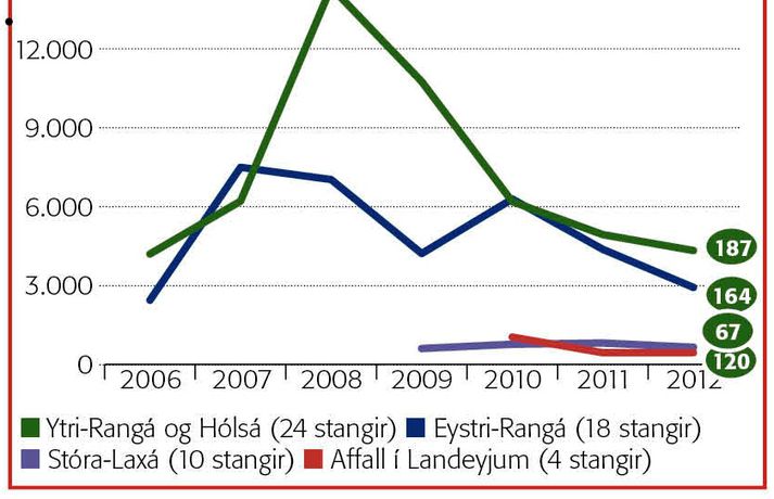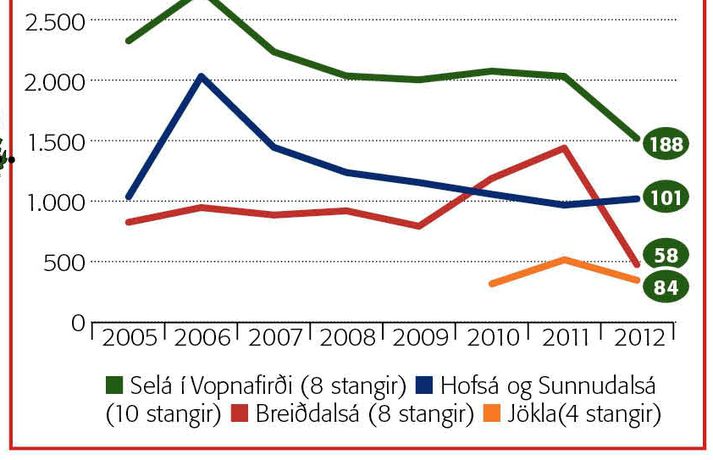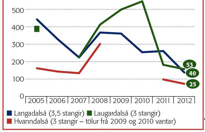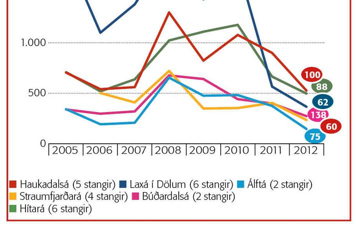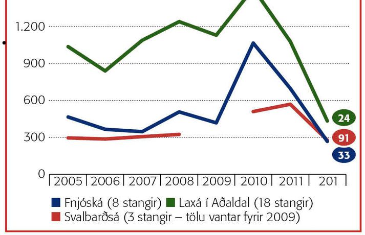 Aðeins 12 af 38 ám sem Veiðivísir tók saman tölur um skiluðu 100 löxum eða meira á hverja stöng síðasta sumar. Hlutfallslega voru því 32 prósent laxveiðiáa með 100 laxa á stöng. Í fyrra var þetta hlutfall 71 prósent en þá skiluðu 27 af 38 laxveiðiám 100 löxum eða meira á stöng. Gröf með upplýsingum um heildarveiði síðan árið 2005 og veiði á stöng er að finna hér til hliðar og er ám þar skipt eftir landshlutum. Þessar tölur koma veiðimönnum vafalaust lítið á óvart enda veiðisumarið það lélegasta í manna minnum. Kunnugir segja að fara þurfi allt aftur til ársins 1930 til að finna lélegri veiðitölur. Það vekur sérstaka athygli að besta veiðin á stöng var í Haffjarðará (191 lax) og Selá í Vopnafirði (188). Báðar þessar ár trónuðu einnig á toppnum í fyrra. Þá skilaði Haffjarðará 254 löxum á stöng og Selá 253. Það segir sínar sögu um laxveiðisumarið í heild að þrátt fyrir að veiðin í þessum aflahæstu ám landsins sé ríflega 25 prósent lakari en í fyrra þá verma þær samt sem áður toppsætið aftur. Auk Haffjarðarár og Selár voru fjórar aðrar ár með meira en 150 laxa á stöng. Ytri-Rangá skilaði 187 löxum (207 í fyrra), Elliðaárnar 166 (230 í fyrra), Eystri-Rangá 164 (244 í fyrra) og Miðfjarðará 161 (236 í fyrra). Átta laxveiðiár með minna en 50 laxa á stöngVið veiðar í Laxá í Aðaldal.Mynd / Trausti HafliðasonSumarið 2011 var einungis ein á á þessum lista sem var með minni veiði en 50 laxa á stöng en það var Hvannadalsá á Vestfjörðum. Nú hefur heldur fjölgað í þessum hópi en alls voru átta laxveiðiár með lélegri veiði en 50 laxa á stöng síðasta sumar. Það er engin smá laxveiðiá sem vermir botninn. Áin hefur reyndar aldrei verið þekkt fyrir fjölda laxa á stöng heldur miklu fremur stórlaxana sem í henni leynast. Laxá í Aðaldal situr sem sagt á botninum með 24 laxa á stöng en í fyrra var hún með 59. Næst á eftir Laxá í Aðaldal kemur Hvannadalsá sem skilaði 25 löxum (33 í fyrra), Fnjóská 33 (86 í fyrra), Svartá í Svartárdal 37 (75 í fyrra), Laugardalsá 40 (61 í fyrra), Víðidalsá 41 (93 í fyrra), Vatnsdalsá 47 (106 í fyrra) og Gljúfurá í Borgarfirði 47 (89 í fyrra).trausti@frettabladid.is