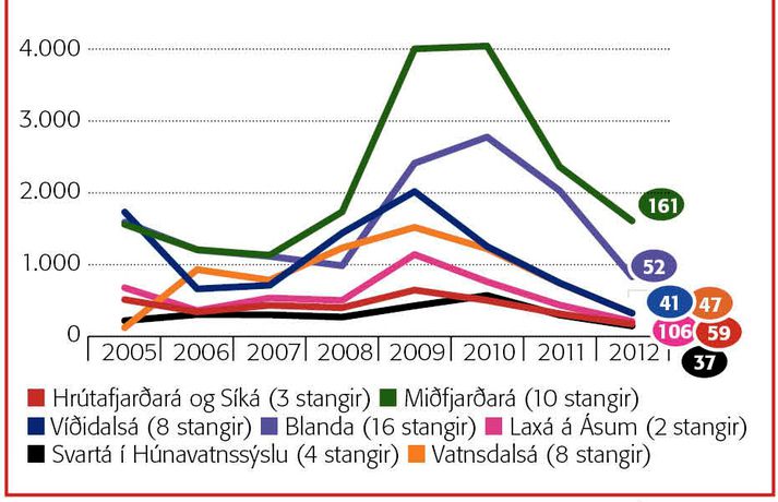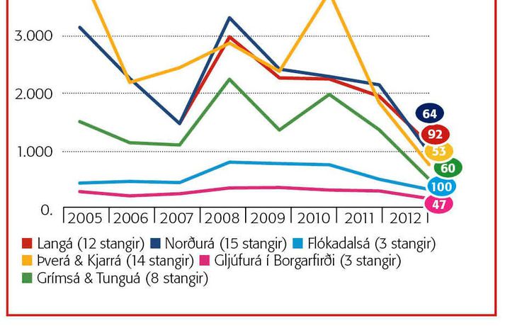 Veiðin 2012: Aðeins 12 af 38 laxveiðiám með 100 laxa á stöng Trausti Hafliðason skrifar 10. nóvember 2012 18:52 Hér geta áhugasamir flett í gegnum átta gröf sem sýna heildarveiðina frá 2005 og veiðina á hverja stöng síðasta sumar. Aðeins 12 af 38 ám sem Veiðivísir tók saman tölur um skiluðu 100 löxum eða meira á hverja stöng síðasta sumar. Hlutfallslega voru því 32 prósent laxveiðiáa með 100 laxa á stöng. Í fyrra var þetta hlutfall 71 prósent en þá skiluðu 27 af 38 laxveiðiám 100 löxum eða meira á stöng. Gröf með upplýsingum um heildarveiði síðan árið 2005 og veiði á stöng er að finna hér til hliðar og er ám þar skipt eftir landshlutum. Þessar tölur koma veiðimönnum vafalaust lítið á óvart enda veiðisumarið það lélegasta í manna minnum. Kunnugir segja að fara þurfi allt aftur til ársins 1930 til að finna lélegri veiðitölur. Það vekur sérstaka athygli að besta veiðin á stöng var í Haffjarðará (191 lax) og Selá í Vopnafirði (188). Báðar þessar ár trónuðu einnig á toppnum í fyrra. Þá skilaði Haffjarðará 254 löxum á stöng og Selá 253. Það segir sínar sögu um laxveiðisumarið í heild að þrátt fyrir að veiðin í þessum aflahæstu ám landsins sé ríflega 25 prósent lakari en í fyrra þá verma þær samt sem áður toppsætið aftur. Auk Haffjarðarár og Selár voru fjórar aðrar ár með meira en 150 laxa á stöng. Ytri-Rangá skilaði 187 löxum (207 í fyrra), Elliðaárnar 166 (230 í fyrra), Eystri-Rangá 164 (244 í fyrra) og Miðfjarðará 161 (236 í fyrra). Átta laxveiðiár með minna en 50 laxa á stöngVið veiðar í Laxá í Aðaldal.Mynd / Trausti HafliðasonSumarið 2011 var einungis ein á á þessum lista sem var með minni veiði en 50 laxa á stöng en það var Hvannadalsá á Vestfjörðum. Nú hefur heldur fjölgað í þessum hópi en alls voru átta laxveiðiár með lélegri veiði en 50 laxa á stöng síðasta sumar. Það er engin smá laxveiðiá sem vermir botninn. Áin hefur reyndar aldrei verið þekkt fyrir fjölda laxa á stöng heldur miklu fremur stórlaxana sem í henni leynast. Laxá í Aðaldal situr sem sagt á botninum með 24 laxa á stöng en í fyrra var hún með 59. Næst á eftir Laxá í Aðaldal kemur Hvannadalsá sem skilaði 25 löxum (33 í fyrra), Fnjóská 33 (86 í fyrra), Svartá í Svartárdal 37 (75 í fyrra), Laugardalsá 40 (61 í fyrra), Víðidalsá 41 (93 í fyrra), Vatnsdalsá 47 (106 í fyrra) og Gljúfurá í Borgarfirði 47 (89 í fyrra).trausti@frettabladid.is Stangveiði Mest lesið Hrútafjarðará löngu uppseld Veiði Fimm ára veiðikona með maríulax í Elliðaánum Veiði Hylurinn er vikulegt hlaðvarp um veiði Veiði Fín veiði í Kvíslaveitum Veiði Veiðigoðsögnin Völundur Þorsteinn er látinn Veiði Norðurá og Hofsá komnar yfir 1.000 laxa Veiði Meiri líkur á góðu vatni í ánum í sumar Veiði Kvikmyndahátið fluguveiðimannsins Veiði Kastað til Bata í Laxá í Kjós Veiði Loksins, loksins! Frábært vatn í Norðurá Veiði