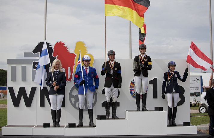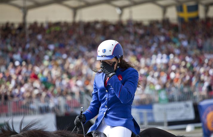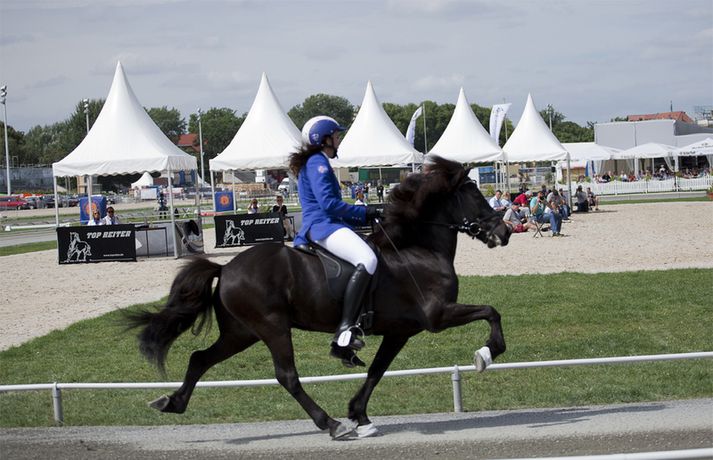 Gústaf Ásgeir Hinriksson og Björk frá Enni urðu að sætta sig við fjórða sætið í slaktaumatölti ungmenna á HM íslenska hestsins í Berlín en úrslitakeppnin fór fram í dag. Þau hreinlega misstu af heimsmeistaratitlinum á lokasprettinum. Rut Sigurðardóttir, ljósmyndari Vísis og Fréttablaðsins á mótinu, tók þessar myndir hér fyrir ofan. Gústaf Ásgeir náði bestu einkunninni í forkeppninni og var efstur eftir frjálsu ferðina og hæga töltið. Gústaf og Björk urðu hinsvegar fyrir truflun í slaka tauminum og það kostaði þau verðlaunasætið. Gústaf Ásgeir og Björk frá Enni voru með 8,50 einkunn fyrir frjálsu aðferðina og 8,00 í einkunn fyrir hæga töltið og því með góða forystu. Einkunnin fyrir slaka tauminn var hinsvegar aðeins 4,17 sem var mikið áfall fyrir íslenska hópinn. Hin þýska Charlotte Passau á Una frá Kronshof varð heimsmeistari en þau fengu 6,92 í einkunn. Landi hennar Christopher Weiss á Víg frá Eikarbrekku varð annar með 6,84 í einkunn og í þriðja sætinu varð síðan hin austurríska Carina Perndl á Reidartýr frá Stefanihof en þau fengu 6,83 í einkunn. Það er hægt að sjá öll úrslitin í slaktaumatöltinu inn á Hestafréttir.is eða með því að smella hér.