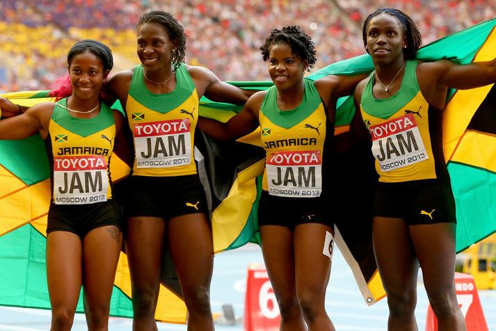 Fraser-Pryce með þrenn gullverðlaun 18. ágúst 2013 15:00 Sveit Jamaíku. Boðhlaupssveit Jamaíku setti heimsmet og vann auðveldan sigur í 4x100 metra boðhlaupi kvenna á heimsmeistaramóti í frjálsum íþróttum sem haldin er í Moskvu. Aðalnúmer sveitarinnar, Shelley-Ann Fraser-Pryce hljóp lokasprett Jamaíku en hún var með sigrinum í boðhlaupinu að tryggja sér sín þriðju gullverðlaun á heimsmeistaramótinu. Frakkar höfnuðu í öðru sæti hlaupsins en Bandaríska sveitin var í þriðja sætinu. Fraser-Pryce hafði fyrr um helgina unnið 100m og 200m einstaklingshlaup með yfirburðum. Frábær árangur hjá þessari mögnuðu íþróttakonu. Frjálsar íþróttir Mest lesið Sakaður um svindl á HM í pílukasti Sport Dómarinn hlýtur mikið lof fyrir stundarbræði í garð Jake Paul og Joshua Sport Pílukastarinn biðst afsökunar á að hafa fallið á lyfjaprófinu og öllum lygunum Sport Arnór Ingvi orðinn leikmaður KR Íslenski boltinn Tvenna frá Rogers tryggði Villa sigur gegn Manchester United Enski boltinn Ótrúleg tíðindi á HM í pílukasti: „Mikið sjokk“ Sport Albert skoraði í fyrsta sigri Fiorentina Fótbolti Haaland gaf barnabarni Hareide gjöf Enski boltinn Tvær títanplötur settar í Jake Paul eftir kjálkabrotið Sport Ronaldo á nærbuxunum lætur Elon Musk efast um sjálfan sig Fótbolti Fleiri fréttir Hjalti Þór ráðinn aðalþjálfari Álftaness HM í pílu: Littler flaug áfram og kvöldinu lauk með spennutrylli Hleður Kjartan lofi eftir frábæra frumraun með Aberdeen Óttast að Isak hafi fótbrotnað Ótrúleg tíðindi á HM í pílukasti: „Mikið sjokk“ Sakaður um svindl á HM í pílukasti Túfa gerir þriggja ára samning í Svíþjóð Arnór Ingvi orðinn leikmaður KR Albert skoraði í fyrsta sigri Fiorentina Rúnar sótti sinn fyrsta sigur sem þjálfari Wetzlar Bæjarar aftur á sigurbraut Tvenna frá Rogers tryggði Villa sigur gegn Manchester United Kolbrún María kom við sögu í endurkomu Hannover Haukur með sjö mörk og Magdeburg rétt marði botnliðið Barcelona með fjögurra stiga forskot inn í nýtt ár Alvöru innkoma: Kjartan með stoðsendingu gegn Celtic í sínum fyrsta leik Sandra María hetjan og með þeim markahæstu í Þýskalandi Katla skoraði annan leikinn í röð Tómas Bent og félagar unnu Rangers og náðu átta stiga forskoti á toppnum Breiðablik kaupir Jónatan frá Norrköping Rúmlega áttræður Moustafa endurkjörinn forseti IHF með yfirburðum Pílukastarinn biðst afsökunar á að hafa fallið á lyfjaprófinu og öllum lygunum Næstframlagshæstur í grátlegu tapi Hildur áfram í bikarnum og Amanda enn á toppnum Fimmta sinn sem Arsenal er á toppnum um jólin: Unnu ekki titilinn í fyrstu fjögur skiptin „Viljum við að okkar verði minnst fyrir að vera skræfur?“ Fékk næstum 4,5 milljóna króna sekt fyrir að sýna dómara fingurinn Tvær títanplötur settar í Jake Paul eftir kjálkabrotið „Ef dómarinn hefði sinnt sínu starfi almennilega hefði Romero ekki fengið spjald“ Haaland gaf barnabarni Hareide gjöf Sjá meira