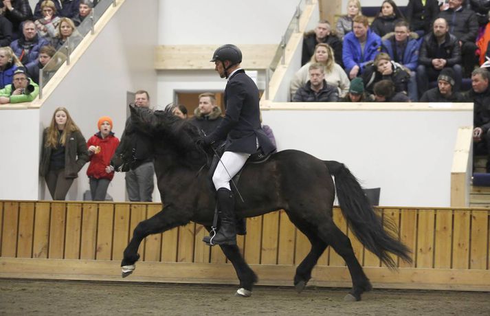 Margt var um manninn og stemning í stúkunni í Sprettshöllinni í Kópavogi í gærkvöldi þegar keppni fór fram í fimmgangi í áhugamannadeildinni. Þórunn Hannesdóttir á glæsihestinum Austra frá Flagbjarnarholti sigraði örugglega og skaut öllum strákunum ref fyrir rass í úrslitunum. Þórunn átti brekkuna og var klappað lof í lófa fyrir sýningu sína. Áhorfendur létu ekki leiðindaveður trufla sig og mættu í Sprettshöllina til að hvetja sitt fólk áfram, eins og sjá má á meðfylgjandi myndasyrpu.Þórunn Hannesdóttir og Austri frá Flagbjarnarholti.Í áhugamannadeildinni urðu úrslit þessi: 1. Þórunn Hannesdóttir / Austri frá Flagbjarnarholti 6,52 2. Árni Sigfús Birgisson / Sjór frá Ármóti 6,19 3. Sigurbjörn J Þórmundsson / Leistur frá Hemlu II 5,90 4. Þorvarður Friðbjörnsson / Þengill frá Þjóðólfshaga 1 5,79 5. Játvarður Jökull Ingvarsson / Kappi frá Dallandi 5,69 6. Leó Hauksson / Bú-Álfur frá Vakurstöðum 5,62 7. Sigurður Grétar Halldórsson / Álmur frá Skjálg 4,05 Keppni í hestaíþróttum er nú að komast á fullt skrið og ber Meistaradeildina hæst, en frá henni er sýnt beint á Stöð 2 Sport aðra hverja viku. Næsta keppni fer fram í fimmgangi fimmtudaginn 26. febrúar og hefur Vísir heimildir fyrir því að þar mæti knapar með mjög sterka hesta til leiks, meðal annars kemur Íslandsmeistarinn í fimmgangi Hulda Gústafsdóttir með hinn fasmikla Birki frá Vatni. Á Stöð 2 Sport eru einnig sýndir upprifjunarþættir Meistaradeildarinnar, einnig á fimmtudagskvöldum, þar sem farið er yfir hverja keppnisgrein, rætt við sigurvegara og dómarar skýra einkunnagjöf og sýningar. Hér fyrir neðan má sjá myndasyrpu frá mótinu í Sprettshöllinni.