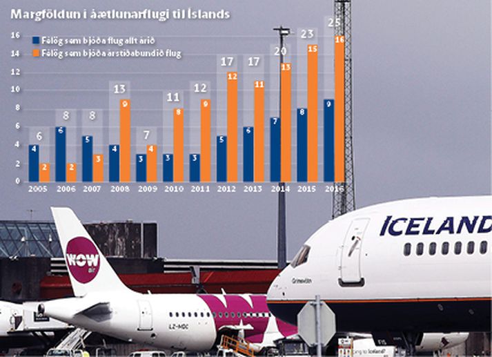 Flug í boði 25 félaga – voru átta fyrir áratug Svavar Hávarðsson skrifar 27. febrúar 2016 06:00 Aldrei hafa eins mörg flugfélög ákveðið að fljúga til og frá Íslandi og á þessu ári. Björn Óli Kárason er forstjóri ISAVIA. Á þessu ári munu fjórfalt fleiri flugfélög bjóða upp á áætlunarflug til og frá Keflavíkurflugvelli en árin fyrir hrun. Alls bjóða níu félög flug til fjölda áfangastaða frá Keflavík allt árið, en önnur sextán félög frá vormánuðum til hausts – eða alls 25. Árið 2005 voru flugfélögin sex alls sem buðu þessa þjónustu, þar af fjögur heilsársflugfélög. Þetta kemur fram í tölfræði sem Isavia tók saman fyrir Fréttablaðið. Ferðamálastofa greindi frá því um miðjan mánuðinn að fjöldi ferðamanna um Seyðisfjörð, Keflavíkurflugvöll og aðra flugvelli hefði verið um 1,3 milljónir árið 2015 eða 291 þúsund fleiri ferðamenn en árið 2014. Aukningin milli ára nemur 29,2 prósentum. Þessar tölur komu fram á sama tíma og öryggismál erlendra ferðamanna voru í hámæli, en í kjölfar þess mátti í ræðu og riti greina áhyggjur af þróuninni. Edward H. Huijbens, prófessor við Háskólann á Akureyri, benti á í viðtali við Fréttablaðið að gestir okkar yrðu örugglega 1,6 milljónir í ár og tvær milljónir árið 2017. „Fjölgun ferðafólks er beintengd vexti alþjóðlegra flugsamgangna og þar er mikil uppsveifla í gangi sem ekki sér fyrir endann á. Landið er klárlega komið í vitund mun stærri hóps fólks um allan heim og með vexti flugsins er alltaf ódýrara og auðveldara að komast hingað,“ sagði Edward. Þegar tölfræði Isavia er greind kemur í ljós hvernig áhugi erlendra flugfélaga á Íslandi sem áfangastað hefur þróast á stuttum tíma. Litið aftur til ársins 2011 voru félögin tólf en eru nú rúmlega helmingi fleiri. Þrefalt til fjórfalt fleiri félög beina vélum sínum hingað á þessu ári en var árin 2005 til 2007, svo eitthvað sé tínt til. Sætaframboð gefur aðra mynd af því sama. Árið 2011 voru 3,4 milljónir sæta í boði en tæplega 6,1 milljón í fyrra. Lendingar í Keflavík fóru úr 12.430 í 19.769 á sama tímabili. Í samantekt turisti.is fyrir um ári kom fram að þegar sumardagskrá flugfélaganna hófst í lok mars í fyrra var boðið upp á áætlunarflug frá Íslandi til 64 flugvalla í 59 borgum og var þá leiguflug á vegum ferðaskrifstofa til sólarstranda ótalið. Tölfræði Ferðamálastofu sýnir enn fremur að fjöldamet voru slegin í öllum mánuðum ársins 2015 á Keflavíkurflugvelli. Aukning milli ára fór yfir 30 prósent fyrstu átta mánuði ársins en hlutfallslega var hún mest milli ára í október 49,3 prósent, september 39,4 prósent og maí 36,4 prósent. Þá liggur fyrir að janúarmet ársins 2015 hefur verið slegið myndarlega og enn svo tugprósentum skiptir – flugfarþegar í Keflavík í janúar voru rúmlega 290.000 eða um 60.000 fleiri en 2015. Ferðamennska á Íslandi Mest lesið Verðbólga eykst verulega Viðskipti innlent Hefja sölu á fyrstu hliðstæðu við Simponi í heiminum Viðskipti innlent Range Rover Sport er lúxusjeppi sem tekið er eftir Samstarf Stefán útvarpsstjóri gáttaður á Stefáni útvarpsstjóra Viðskipti innlent Skellir í vél á morgnana og nokkuð ánægð með sjálfan sig í gjafavali Atvinnulíf „Eitt sinn var ég ekki svo lánsöm að tilheyra stóru vinkonusamfélagi“ Atvinnulíf Framkvæmdastjóri Lyfjavals hættur Neytendur Kvartanir berast í hverri viku vegna gjafabréfa Neytendur Eldsneytisverð lækkar um tæplega hundrað krónur á nýju ári Neytendur Gréta María um starfslokin: „Ég geng stolt frá borði“ Viðskipti innlent Fleiri fréttir Frosti og Arnþrúður fá styrki Verðbólga eykst verulega Hefja sölu á fyrstu hliðstæðu við Simponi í heiminum Stefán útvarpsstjóri gáttaður á Stefáni útvarpsstjóra Eyða óvissu á lánamarkaði strax á mánudag Ljúka kaupum á Hreinsitækni og HRT þjónustu Gréta María um starfslokin: „Ég geng stolt frá borði“ Síminn fær heimild til að reka áfram 2G og 3G þjónustu Breyta nafni Ölgerðarinnar Jón Ingi nýr forstjóri PwC Tekur við sem hagfræðingur Viðskiptaráðs Gréta María óvænt hætt hjá Prís Ráðinn nýr fjármála- og rekstrarstjóri Lyfja og heilsu Þrír eða færri skoða eign í fyrstu viku á sölu Byrjunarverð hjá NiceAir tæplega sextíu þúsund krónur Leigan rukkuð mánaðarlega en ekki í lokin Frá Logos til Samtaka fyrirtækja í sjávarútvegi Alcoa stefnir Eimskip að nýju í samráðsmáli Aron Kristinn stofnar goðsagnakennt fyrirtæki Vill verða stjórnarformaður Íslandsbanka: „Hvaða sirkus er þetta?“ Geta þurft að greiða hátt verð fyrir póstsendar gjafir Segja ráðherra fórna íslenskum hagsmunum í makrílsamningi Ísland gerir samkomulag um makrílveiðar í fyrsta skipti Sif nýr framkvæmdastjóri Aton Hvað græði ég á að leggja aukalega inn á lánið? Edda Rós til Hagstofunnar Fjármálaráðuneytið: „Ekki tapa peningum“ 15 ára afmæli kynjakvóta: „Langt frá því að vera fyrirmyndarríkið sem við teljum okkur vera“ Tinna nýr framkvæmdastjóri upplýsingatæknisviðs hjá Innnes „Enginn í Lottu er á mannsæmandi launum“ Sjá meira