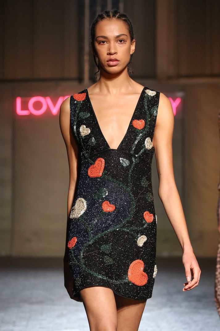 Danska tískumerkið Ganni sýndi haustlínu sína á tískuvikunni í kaupmannahöfn í gærkvöldi. Tískusýningin var með yfirskriftinni Love Society enda var línan afar rómantískt. Allar fyrirsæturnar voru klæddar í rauða skó enda voru aðal litir sýningarinnar rauður, svartur og kremaður sem tónuðu allir vel saman. Sniðin voru afslöppuð em til dæmis var mikið um síða langerma kjóla, síðar og útvíðar buxur við hettupeysur og silki skyrtur. Þrátt fyrir að línan muni ekki lenda í búðum fyrr en í lok sumars bíðum við spenntar enda margt fallegt sem við gætum hugsað okkur að eignast. Smáatriðin sem og heildarmyndin eru einstaklega vel heppnuð að þessu sinni hjá Ganni.