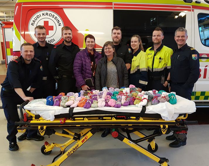 Prjónuðu bangsarnir veita börnum huggun í erfiðum aðstæðum Sylvía Rut Sigfúsdóttir skrifar 8. febrúar 2018 14:15 Arndís Hilmarsdóttir og Brynja Bjarnadóttir afhentu 82 nýja bangsa fyrir jólin. Mynd/Slökkviliðið á höfuðborgarsvæðinu Arndís Hilmarsdóttir setti af stað samfélagsverkefnið Sjúkrabílabangsar sem gengur út á að prjóna bangsa fyrir börn sem þurfa á aðstoð sjúkraflutningmanna að halda. Bangsinn er hugsaður sem huggun og fær barnið auðvitað að eiga bangsann. Verkefnið hefur stækkað ört og nokkur hundruð taka þátt í að prjóna bangsa sem tengiliðir um land allt sjá svo um að afhenda. „Við heyrðum af verkefni í Noregi með svona bangsa og ákváðum bara að fara í þetta og framkvæma.“Tengiliðir víða um landið Í nokkur ár hefur þessi hópur starfsfólks í Foldaskóla prjónað jólagjafir fyrir vökudeild Barnaspítala Hringsins og einnig prjónað föt fyrir Konukot og fleiri staði þar sem þörf er fyrir slíkt. Rétt fyrir jólin fór Arndís ásamt Brynju Bjarnadóttir og færði Slökkviliðinu á höfuðborgarsvæðinu 82 nýja bangsa frá starfsfólkinu í Foldaskóla en hópurinn afhenti alls 230 bangsa árið 2017. En þessi hópur er ekki einn að prjóna, um allt land eru fleiri sem taka þátt í þessu verkefni. „Ég er með tengiliði um allt land, mikið til í kvenfélögum á hverjum stað. Tengiliðirnir sjá um að afhenda bangsa og láta vita ef vantar svo hægt sé að dreifa þeim ef það er of mikið á einum stað en of lítið á öðrum.“ Upplýsingar um tengiliðina má finna á Facebook síðu verkefnisins.Staðsetning tengiliðanna er merkt með rauðum punktum á kortinu.Mynd/SjúkrabílabangsarBangsarnir hugga börnin Bangsarnir eru ekki aðeins fyrir börn sem flutt eru með sjúkrabíl heldur öll börn sem þurfa á aðstoð sjúkraflutningamanna að halda. Ef foreldri eða systkini barns er flutt í burtu með sjúkrabíl er barninu líka gefinn slíkur bangsi, sem getur hjálpað barninu í erfiðum eða stressandi aðstæðum.„Þetta á að veita smá huggun.“ Þeir einstaklingar sem taka þátt leggja sjálfir út fyrir efniskostnaði eða nota afgangsgarn sem til er á heimilinu. Arndís er mjög ánægð með þau viðbrögð sem þetta verkefni hefur fengið og vonar að enn fleiri vilji taka þátt. „Ég hef fengið góð viðbrögð bæði frá foreldrum barna sem þurfa að nota þetta og mjög góð viðbrögð frá slökkviliðinu og sjúkraflutningaþjónustum um landið.“Bangsarnir eru tilbúnir í sjúkrabílunum þegar á þarf að halda.Mynd/Slökkviliðið á höfuðborgarsvæðinuAllir geta hjálpað Bangsarnir eru flestir prjónaðir eftir uppskrift sem finna má á Facebook síðu Sjúkrabílabangsa en þeir eru misjafnir af stærð, áferð og lit eftir því hvernig garn er valið og á hvaða stærð af prjónum þeir eru gerðir. „Það er náttúrulega enginn skyldugur til þess að nota forskriftina en hún er svona hugsuð sem hjálpartæki til að koma fólki af stað.“ Flestir starfsmenn Foldaskóla taka þátt í verkefninu með einhverjum hætti. Arndís segir að margir prjóni, einhverjir troði í og sauma saman og aðrir kaupi efnið. Fundartímar eru nýttir vel og eiga starfsmenn ánægjulega samveru í kaffitímum að vinna að þessu verkefni. Hún skorar á starfsmenn annarra grunnskóla og alla aðra til að taka þátt í þessu samfélagsverkefni og halda því gangandi. „Það geta allir verið með og það þarf ekki að vera mikið frá hverjum og einum,“ segir Arndís að lokum. Heilbrigðismál Mest lesið Fátækari eftir að hafa svindlað á ferðakonum Innlent Hvar er opið á aðfangadag? Innlent Tveir lögreglumenn sprengdir í loft upp Erlent Blússandi hagvöxtur í Bandaríkjunum Erlent Minni rekstrarkostnaður fyrir eigendur bensínháka Innlent Bæta við allt að 200 íbúðum og mathöll í Spöngina Innlent Foreldrar skipverjans fá áheyrn í Hæstarétti Innlent Maður í umferðarslysi reyndist fíkniefnasali Innlent Arion banki varar við svikaherferð Innlent Innflytjendamálin almenningi efst í huga Innlent Fleiri fréttir Gleðileg jól, kæru lesendur Einn fluttur á sjúkrahús eftir bílslys Skiluðu hagnaði á kosningaári Hátíðarveisla á kaffistofu Samhjálpar: „Það er ró og friður yfir fólki“ Björgunarsveitin kölluð út í fokverkefni Grjóthrun undir Eyjafjöllum Fátækari eftir að hafa svindlað á ferðakonum Arion banki varar við svikaherferð Innanlandsflugi aflýst Foreldrar skipverjans fá áheyrn í Hæstarétti Hvar er opið á aðfangadag? Innflytjendamálin almenningi efst í huga Bæta við allt að 200 íbúðum og mathöll í Spöngina Maður í umferðarslysi reyndist fíkniefnasali Minni rekstrarkostnaður fyrir eigendur bensínháka Hafnar „jólakveðju“ ríkisins Hefði þurft hjólbörur undir öll verðlaunin sín Ýmis ráð til taugatrekktra á Þorláksmessu Ekkert því til fyrirstöðu að Ásthildur Lóa verði aftur ráðherra Óvissa um ráðherraskipan og skata fyrir byrjendur Maðurinn fundinn Sigríður Halldórsdóttir nýr ritstjóri Kastljóss Íslendingur í gæsluvarðhaldi í Kólumbíu vegna gruns um kynferðisbrot Forsætisráðuneytið eyddi meiru í almannatengla í fyrra en í ár Inkalla snuð vegna of mikils magns BPA-plastefna Svanhildur Sif heiðruð Falskar netverslanir: Auglýsir rýmingarsölu nokkrum dögum eftir opnun Meðallaun upplýsingafulltrúa hækkuðu hlutfallslega mest Skötuilmurinn leggst yfir landið og Samkeppniseftirlitið ætlar að fylgjast vel með bensínverðinu Áfram auknar líkur á eldgosi Sjá meira