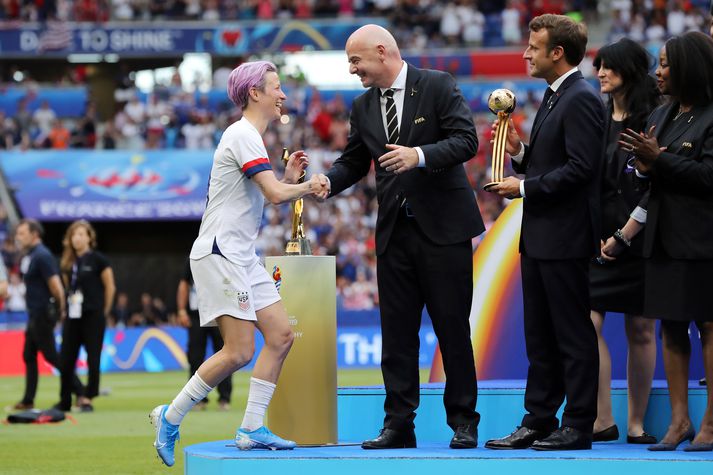 Megan Rapinoe fer heim til Bandaríkjanna með þrjú gullverðlaun frá HM í Frakklandi því hún var kjörin besti leikmaður mótsins og var einnig markahæst. Bandaríkin vann Holland 2-0 í úrslitaleik mótsins sem fór fram í Lyon í dag en þar skoraði Rapinoe fyrsta mark leiksins úr vítaspyrnu. Hún fær þar af leiðandi Gullboltann sem besti leikmaður mótsins en hún fór á kostum í mótinu. Lucy Bronze úr enska liðinu var í öðru sætinu og Rose Lavelle, samherji Rapinoe, var í því þriðja.adidas Golden Ball: Megan RAPINOE - #USA Lucy BRONZE - #ENG Rose LAVELLE - #USA#FIFAWWCpic.twitter.com/ayJjnfGR1d — FIFA Women's World Cup (@FIFAWWC) July 7, 2019 Rapinoe var eins og áður segir einnig markahæsti leikmaður mótsins. Hún skoraði sex mörk, eins og Alex Morgan, en spilaði færri mínútur en Morgan og fær því gullskóinn. Morgan tekur silfurskóinn og sú þriðja markahæsta var Ellen White úr enska landsliðinu. Tvö mörk voru einnig dæmd af Ellen eftir skoðun í VARsjá í mótinu en hún endar með fimm mörk.adidas Golden Boot: Megan RAPINOE - #USA Alex MORGAN - #USA Ellen WHITE - #ENG#FIFAWWCpic.twitter.com/B6eBn2n3iq — FIFA Women's World Cup (@FIFAWWC) July 7, 2019 Rapinoe hefur staðið í ströngu á meðan mótinu stendur og einnig verið dugleg að láta Bandaríkjaforseta, Donald Trump, heyra það. Hún sagðist meðal annars ekki ætla að heimsækja Trump verði liðinu boðið þangað vegna gullsins, en það er venjan í Bandaríkjunum að vinni landslið þjóðarinnar til gullverðlauna, heimsæki þau Hvíta húsið.