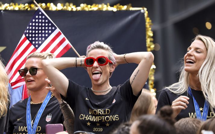Árið 2019 hefur verið magnað hjá bandarísku knattspyrnukonunni Megan Rapinoe sem varð fyrst heimsfræg fyrir að stinga upp í Donald Trump Bandaríkjaforseta en fylgdi því síðan eftir með að ná gullnu þrennunni á HM í Frakklandi. Megan Rapinoe varð heimsmeistari með bandaríska landsliðinu auk þess að vinna líka Gullhnöttinn sem besti leikmaður mótsins og gullskóinn sem markahæsti leikmaður mótsins. Megan Rapinoe hefur verið frábær talsmaður bandaríska liðsins og kvennaknattspyrnu í heiminum með því að berjast fyrir jafnrétti og samstöðu frekar en óréttlæti og ósætti sem hefur aukist eftir að Donald Trump tók við.Megan Rapinoe, a captain of the United States women’s soccer team, has scored a book deal. “I hope this book will inspire people to find what they can do, and in turn inspire other people around them to do the same,” she said. https://t.co/zlZY2r6v3k — The New York Times (@nytimes) July 25, 2019 Megan Rapinoe er núna búin að finna nýja leið til að koma boðskap sínum til skila. New York Times segir frá því að Megan Rapinoe sé nú að skrifa bók sem eigi að koma út næsta haust. „Ég vonast til þess að þessi bók muni hvetja fólk til að gera það sem það getur og um leið hvetja annað fólk í kringum sig til að fylgja í kjölfarið,“ sagði Megan Rapinoe við New York Times. Rapinoe hefur ekki valið nafn fyrir bók sína en þetta verður bók um meira en íþróttir. Miðað við ræður Megan Rapinoe á sigurhátíð bandaríska liðsins og viðtöl hennar við bandaríska fjölmiðla þá verður hún örugglega mjög pólitísk.Two-time World Cup champ Olympic gold medalist ? USWNT co-captain ? Author Megan Rapinoe is writing a book. https://t.co/cgZaiZBlOI — Sporting News (@sportingnews) July 25, 2019Penguin Press gefur bókina út og segir að í bók þessari muni Rapinoe segja frá persónulegum hlutum og því sem hún hefur lært á sinni viðburðaríku ævi. „Fullt af konum, margar frábærir fótboltamenn, hafa skrifað endurminningar. Megan hefur annan vettvang. Ég horfði á HM og hugsaði. Þarna er kona sem líður vel í eigin skinni,“ sagði Ann Godoff, forseti og ritstjóri útgáfunnar. Hún sá það á eigin börnum hvað þau voru spennt fyrir Rapinoe vegna ósvikinnar framkomu hennar. „Hún er bara að koma frá hreinskilnum og afdráttarlausum stað þar sem hún kemur óhrædd fram og segir: Þetta er ég. Það er það sem ég tel að muni hrífa marga,“ sagði Godoff.Hún er mjög vinsæl með unga fólksins.Getty/Jeff Siner