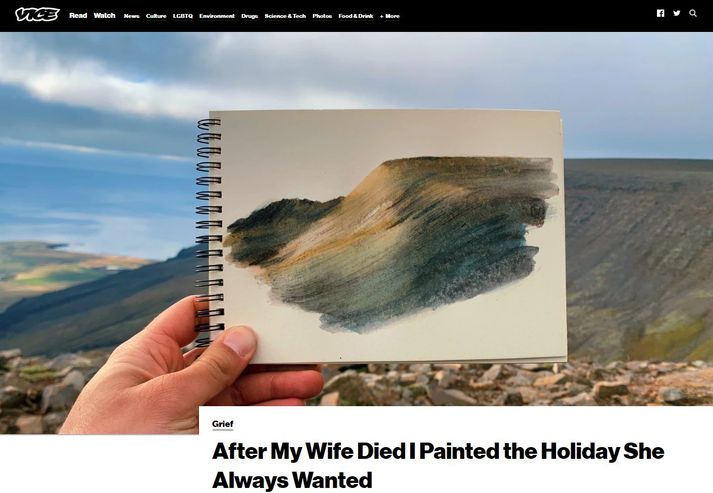 Ferðaðist til Íslands og málaði draumafrí látinnar eiginkonu sinnar Tryggvi Páll Tryggvason skrifar 5. febrúar 2020 13:21 Forsíða pistilsins á vef Vice. Mynd/Skjáskot Ástralinn Jeremy Ley ferðaðist nýverið til Íslands. Markmiðið var að fara í draumafríið sem hann og eiginkona hans höfðu alltað ætlað sér í. Hún lést nýverið úr krabbameini og því ákvað Ley að láta verða af Íslandsferðinni og mála ferðina, allt fyrir ástina í lífi hans. Ley skrifaði hjartnæman pistil um ferðina, söknuðinn og sorgina sem fylgir því að missa maka á bandarísku vefsíðunni Vice. „Við Tess töluðum alltaf um að fara til Íslands. Þetta var einn af hlutunum á þessum endalausa lista yfir hluti til að gera,“ skrifar Ley. Þar lýsir hann áfallinu sem fjölkyldan varð fyrir þegar Tess greindist með krabbamein í brjósti, komin tuttugu vikur á leið með annað barn þeirra. Í pistlinum lýsir hann því hvað hafi tekið við eftir greininguna. Endalausar sjúkrahúsferðir, sársauki, hlátur, sorg og að lokum dauði. Íslandsferðin var hans leið til þess að uppfylla drauma þeirra beggja.Lýsir hann því hvernig hann hafi verið að aka eftir þjóðvegi eitt þegar hann sá Esjuna og hvernig hann hafi hugsað með sér að þetta fjall yrði hann að klífa.„Þrátt fyrir ískaldan vindinn stóð ég á fjallstindinum. Ég settist niður og fór að mála. Svona talaði eiginkonan mín um ævintýri,“ skrifar hann.Í greininni má einnig sjá fjölmargar vatnslitamyndir sem Ley málaði á ferðum sínum um Ísland, meðal annars frá Esjunni, Mýrdalsjökli, Þingvöllum og Þakgili.Lesa má pistili Ley hér. Ferðamennska á Íslandi Íslandsvinir Myndlist Mest lesið Helvíti á jörðu: Emmsjé Gauti minnti á líkamsræktarþjálfara í maníu Gagnrýni Hefur misst vini og kunningja vegna skoðana sinna Lífið Veikindi eyðilögðu líka stóru stund Manúelu Lífið „Ég hugsa til þín á hverjum einasta degi“ Lífið Stjörnulífið: Óskar tíkunum gleðilegra jóla Lífið Leitin á Svínafellsjökli sem hefur enn ekki skilað árangri Lífið Wire-stjarna látin langt fyrir aldur fram Bíó og sjónvarp Kimmel ávarpar bresku þjóðina: Frábært ár fyrir fasisma Lífið Jólatónleikar eru ekki tónlist. Þeir eru neyðaraðgerð Gagnrýni „Sat í átta klukkutíma á dag og horfði út um gluggann“ Menning Fleiri fréttir Saga jarðaði alla við borðið Vísa ásökunum Skinner um kosningasvindl á bug Kimmel ávarpar bresku þjóðina: Frábært ár fyrir fasisma „Ég hugsa til þín á hverjum einasta degi“ Stjörnulífið: Óskar tíkunum gleðilegra jóla Veikindi eyðilögðu líka stóru stund Manúelu Hefur misst vini og kunningja vegna skoðana sinna Leitin á Svínafellsjökli sem hefur enn ekki skilað árangri Krakkatía vikunnar: Ísskápastríð, Eivör og Grafarvogur „Við byrjuðum að hlusta á jólalög í júlí“ Frægir fundu ástina 2025 Íslenska stelpan sem gerðist mormóni Fréttatía vikunnar: Rob Reiner, Dóra Björt og fullir unglingar 500 Esjuferðir á árinu: „Sumir hrista bara hausinn og lygna augunum“ Útgefandi Walliams lætur hann róa Fáklæddir barþjónar þegar Regnboginn opnaði í Bíó Paradís Þriðja stigs krabbameinið það besta sem kom fyrir hann Dúnninn bakaður í fjóra sólarhringa til að drepa allt í honum Heilsu krónprinsessunnar hrakar gríðarlega Pete orðinn pabbi Nýkominn úr meðferð og „sjaldan verið betur nýsleginn túskildingur“ Laufey á lista Obama „Ég heyrði þá kalla á mig en gat engu svarað“ Opnar sig í fyrsta sinn: Kyssti yfirmanninn í fyrsta sinn þetta kvöld Sex hundruð ára kastali Björns í Frakklandi svo gott sem klár Fyrirsát að Valgerði, Stund Pírata og meint alzheimer Þráins Bertelssonar „Það jafnar sig enginn eftir svona og við munum aldrei gera það“ Ungir sjálfstæðismenn gefa út vandræðalegt fjölskyldudagatal Keough sögð líffræðileg móðir Benjamin Travolta Rússland aftur í Eurovision - undirskriftasöfnun Sjá meira