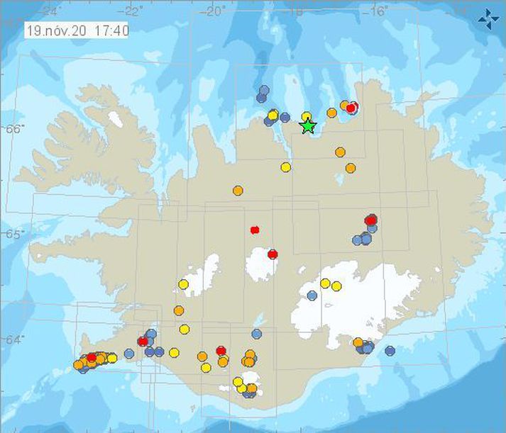 Jarðskjálfti að stærðinni 3 varð nærri Flatey á Skjálfanda Hallgerður Kolbrún E. Jónsdóttir skrifar 19. nóvember 2020 18:24 Jarðskjálfti af stærðinni 3,0 varð nærri Flatey á Skjálfanda síðdegis í dag. Veðurstofa Ísland Síðdegis í dag varð skjálfti af stærðinni 3,0 um sjö kílómetrum suðaustan af Flatey á Skjálfanda. Tilkynningar hafa borist Veðurstofu Íslands um að skjálftinn hafi fundist í byggð. Skjálftinn varð klukkan 17:21 og hafa enn sem komið er engir eftirskjálftar mælst. Nokkrir minni skjálftar hafa orðið á svæðinu undanfarna daga en skjálftinn varð á Húsavíkur-Flateyjarmisgenginu og er það þekkt skjálftasvæði. Nú síðdegis kl. 17:21 varð skjálfti af stærð M3,0 um 7 km SA af Flatey á Skjálfanda og hafa, samkvæmt upplýsingum frá...Posted by Almannavarnadeild ríkislögreglustjóra on Thursday, November 19, 2020 Eldgos og jarðhræringar Norðurþing Mest lesið Hrindir af stað söfnun fyrir móður stúlkunnar sem lést í Suður-Afríku Innlent Málið sem Trump getur ekki losað sig við Erlent Varð vitni að ótrúlegum norðurljósum: „Mér fannst þetta magnað“ Innlent Færir nýársboðið fram á þrettándann Innlent Þau eru tilnefnd sem maður ársins Innlent Fjórir fluttir á sjúkrahús eftir bílveltu á Suðurlandi Innlent Ætlar ekki að beita sér í máli starfsmanns Útlendingastofnunar Innlent „Ég vil ekki nokkurn tímann sjá neitt svona aftur“ Innlent Hljóti að vera komið að því að skoða öryggisgæslu við skóla Innlent Sextán ára fékk greitt fyrir að færa Epstein stúlkur Erlent Fleiri fréttir Hrindir af stað söfnun fyrir móður stúlkunnar sem lést í Suður-Afríku Varð vitni að ótrúlegum norðurljósum: „Mér fannst þetta magnað“ Færir nýársboðið fram á þrettándann Fjórir fluttir á sjúkrahús eftir bílveltu á Suðurlandi Leggur aftur til hverfislögreglustöð í Breiðholti Nú má heita Love, Tóní, Ranimosk og Draumur Kvartar til umboðsmanns og vonar að Vegagerðin sjái að sér Ætlar ekki að beita sér í máli starfsmanns Útlendingastofnunar „Ég vil ekki nokkurn tímann sjá neitt svona aftur“ Gyðingar á Íslandi upplifa aukinn ótta Ferðaþjónusta blómstrar í uppsveitum Árnessýslu „Þetta er bara ljótt“ Hljóti að vera komið að því að skoða öryggisgæslu við skóla Ætlar að skýra hvenær rjúfa megi þagnarskyldu Þagnarskylda heilbrigðisstarfsfólks og öryggisgæsla við grunnskóla Eyjólfur í orlof og Inga þrefaldur ráðherra Vegagerðin segir flóðin í Vík fyrirséð Fjölmiðlar, bókmenntir og hægrimennska á Sprengisandi „En hver sagði að þetta ætti að vera auðvelt?“ Milljónir til almannatengla og átta sinnum meira en í fyrra Grunuð um að koma til landsins til að brjóta á öldruðum Leggja hald á skip á alþjóðahafsvæði undan ströndum Venesúela Bindur vonir við Vor til vinstri Systir og amma drengs í meðferð létust í Suður-Afríku „Við erum pottþétt að koma út í mínus, hversu miklum vitum við ekki“ „Þetta er alveg ásættanlegur samningur“ Deildi nöfnum skjólstæðinga á Instagram Íslendingar þægileg fórnarlömb fyrir vasaþjófa „Að öllu óbreyttu mun þjóðvegurinn fara í sundur“ Vonbrigði í Vík og rýnt í Epstein-skjölin Sjá meira