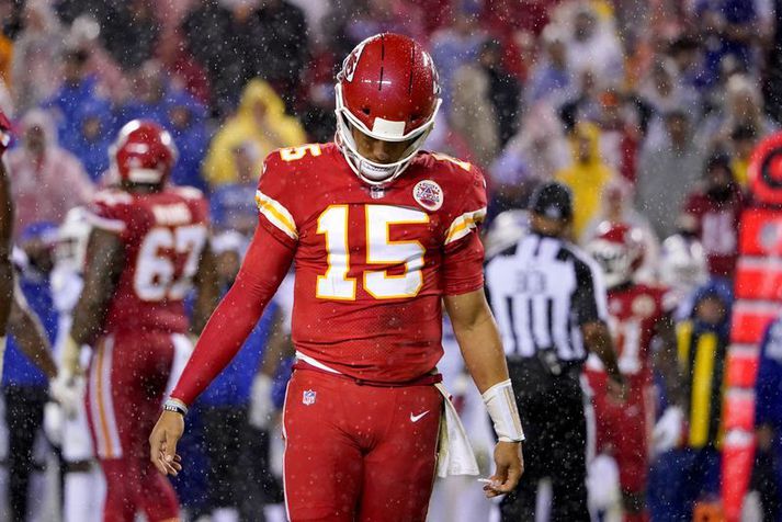 Buffalo Bills vann leikinn 37-20 og hefur þar með unnið fjóra leiki í röð en á sama tíma var Chiefs liðið að tapa í þriðja sinn í fimm leikjum. Mahomes, sem hefur viðurnefnið Tengdasonur Mosfellsbæjar hér á landi, var sjálfgagnrýninn í viðtölum eftir leikinn en liðið hefur nú tapað tveimur heimaleikjum í röð. Pick-6! How about the @BuffaloBills?! #BillsMafia : #BUFvsKC on NBC : https://t.co/6zBjGnL9LY pic.twitter.com/j2ptK5x9tK— NFL (@NFL) October 11, 2021 „Þetta byrjar allt hjá mér,“ sagði Patrick Mahomes sem kastaði boltanum tvisvar sinnum frá sér og glataði honum einu sinni á jörðinni líka. „Þetta er eitthvað sem ég hef ekki verið vanur að gera mikið af á mínum ferli en nú þarf ég að endurskoða hvar ég er staddur og hvaða ákvarðanir ég er að taka,“ sagði Mahomes. „Ég hef verið svolítið klikkaður leikmaður þegar kemur að skrölti og köstum en ég hef aldrei verið leikmaður sem er að kasta boltanum mikið frá mér. Nú þarf ég að endurskoða leikstílinn og hvað ég er að gera og það er ekkert annað í boði en að hætta því,“ sagði Mahomes. The rookie @gregrousseau with the red zone INT! #BillsMafia : #BUFvsKC on NBC : https://t.co/6zBjGnL9LY pic.twitter.com/hFgtEkfU7w— NFL (@NFL) October 11, 2021 Buffalo Bills komst í 31-13 í leiknum eftir að hafa stolið sendingu frá Mahomes og hlaupið með hana alla leið í markið. Mahomes hefur þegar kastað boltanum sex sinnum frá sér á leiktíðinni en mest hefur hann kastað boltanum tólf sinnum frá sér á heilu tímabili. Hann mun bæta það met ríflega með sama áframhaldi. Buffalo Bills náði með þessum sigri að hefna fyrir tapaði á móti Chiefs í úrslitakeppninni á síðustu leiktíð. Það þurfti reyndar að gera meira en klukkutíma hlé á leiknum vegna þrumuveðurs og það rigndi mikið í seinni hálfleiknum. .@JoshAllenQB is on a roll. A 53-yard touchdown to @dawson_knox! #BillsMafia : #BUFvsKC on NBC : https://t.co/6zBjGnL9LY pic.twitter.com/c1eJud1LgL— NFL (@NFL) October 11, 2021 Josh Allen, leikstjórnandi Buffalo, var frábær en hann átti þrjár snertimarkssendingar auk þess að hlaupa 62 jarda með boltann og skora eitt snertimark sjálfur. Það var að venju mikið fjör í leikjum sunnudagsins í NFL-deildinni. Better catch by I pic.twitter.com/gCJE7NGBIt— Deandre Hopkins (@DeAndreHopkins) October 11, 2021 Arizona Cardinals liðið er enn ósigrað eftir 17-10 sigur á San Francisco 49ers. DeAndre Hopkins skoraði snertimarkið sem tryggði sigurinn og var líka ánægður með sig eins og sjá má hér fyrir ofan. TODAY WE SPELL REDEMPTION.... M-A-S-O-N. #GoPackGo #GBvsCIN pic.twitter.com/5iuT9KWn2K— NFL (@NFL) October 10, 2021 Green Bay Packers vann sinn fjórða sigur í röð en á dramatískan hátt. Sparkarinn Mason Crosby klikkaði á þremur vallarmörkum í röð áður en hann skoraði sigurvallarmarkið í framlengingunni í 25-22 sigri á Cincinnati Bengals. Tom Brady og félagar í Tampa Bay Buccaneers unnu 45-17 stórsigur á Miami Dolphins þar sem Brady átti fimm snertimarkssendingar. It's just @TomBrady things. 361 yards and 4 TDs for the : #MIAvsTB on CBS : NFL app pic.twitter.com/efczapH77l— NFL (@NFL) October 10, 2021 Jacksonville Jaguars tapaði 31-19 á móti Tennessee Titans sem þýðir að liðið hefur nú tapað tuttugu leikjum í röð. Carolina Panthers vann þrjá fyrstu leiki sína en tapaði öðrum leiknum í röð í gær nú 21-18 á móti Philadelphia Eagles. Leikstjórnandi Eagles, Jalen Hurts, skoraði sjálfur tvö snertimörk á jörðinni í endurkomusigri og annað þeirra tryggði sigurinn. Sparkarinn Greg Joseph tryggði Minnesota Vikings 19-17 sigur á Detroit Lions með vallarmarki í lokin en Ljónin töpuðu enn einu sinni á grátlegan hátt og hafa tapað öllum fimm leikjum tímabilsins. Nick Folk, sparkari New England Patriots, tryggði liðinu 25-22 sigur á Houston Texans með vallarmarki undir lokin en viku áður sparkaði hann í stöngina og út þegar hann gat tryggt liðinu sigur á Tom Brady og félögum í Tampa Bay Buccaneers. Hér fyrir neðan má sjá öll snertimörkin frá því í gær. Every touchdown from NFL RedZone in Week 5! pic.twitter.com/ssJkzn4Zwu— NFL (@NFL) October 11, 2021 Úrslit í NFL-deildinni í gær og nótt: (Heimaliðið er á eftir) Chicago Bears 20-9 Las Vegas Raiders Cleveland Browns 42-47 Los Angeles Chargers San Francisco 49ers 10-17 Arizona Cardinals New York Giants 20-44 Dallas Cowboys Buffalo Bills 38-20 Kansas City Chiefs New York Jets 20-27 Atlanta Falcons Denver Broncos 19-27 Pittsburgh Steelers New Orleans Saints 33-22 Washington New England Patriots 25-22 Houston Texans Miami Dolphins 17-45 Tampa Bay Buccaneers Green Bay Packers 25-22 Cincinnati Bengals (Framlenging) Detroit Lions 17-19 Minnesota Vikings Philadelphia Eagles 21-18 Carolina Panthers Tennessee Titans 37-19 Jacksonville Jaguars JUSTIN HERBERT AND MIKE WILLIAMS DID IT AGAIN! #BoltUp : #CLEvsLAC on CBS : NFL app pic.twitter.com/1aT7cBWbxG— NFL (@NFL) October 10, 2021