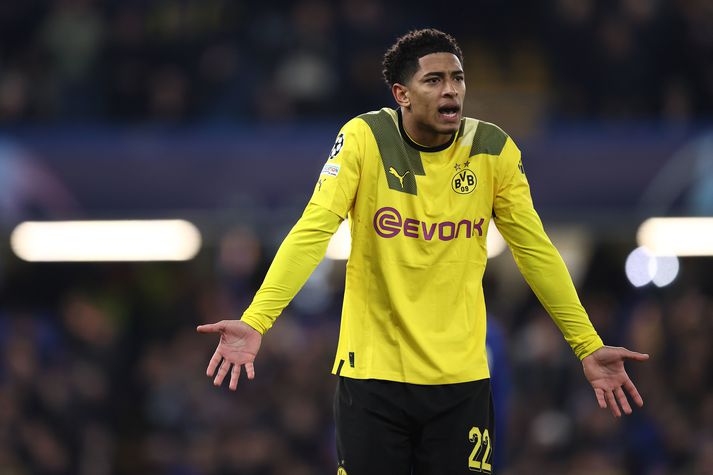 Staðan var 1-1 samanlagt í einvíginu þegar Chelsea fékk víti eftir aðstoð Varsjárinnar. Kai Havertz tók vítið en skaut í stöngina. Varsjáin var þó ekki hætt því hún lét endurtaka vítið þar sem nokkrir leikmenn Dortmund voru komnir of snemma inn í teig. Havertz's penalty re-take a 'joke', says Bellingham as Dortmund crash out https://t.co/vZVWN23nkO pic.twitter.com/jIMxunAUmp— Reuters (@Reuters) March 8, 2023 Kai Havertz tók vítið aftur og skoraði. Hann tryggði Chelsea þar með 2-0 sigur í leiknum og komst liðið því áfram 2-1 samanlagt. Vítið hafði verið dæmt á hendi á Marius Wolf. Bellingham var ósáttur með báða myndbandadómana. „Ég veit ekki hvað annað hann gæti gert með hendinni sinni,“ sagði Jude Bellingham um vítadóminn en svo var komið að því að tjá sig um endutöku vítaspyrnunnar. Jude Bellingham has had his say on the penalty that saw Chelsea knock Borussia Dortmund out of the #UCL pic.twitter.com/oYmpa4EbTX— The Athletic | Football (@TheAthleticFC) March 7, 2023 „Það voru vonbrigði að þetta skyldi vera víti en sú staðreynd að þeir fengu að endurtaka vítið er bara brandari,“ sagði Bellingham. „Í öllum vítaspyrnum, sérstaklega þegar menn hlaupa svona hægt að boltanum, þá eru leikmenn komnir eitthvað inn í teiginn. Hann tók þessa ákvörðun og við verðum að lifa með henni,“ sagði Bellingham. „Ég vil samt ekki segja meira og koma mér í vandræði. Ég hef borgað þeim nógu mikið hingað til,“ sagði Bellingham ósáttur. 6 Borussia Dortmund s Jude Bellingham is making his sixth start in the knockout stages of the Champions League, tying Trent Alexander-Arnold for the most starts by an English teenager in the knockout stages of the #UCL. Regular. pic.twitter.com/b7KZcO4ywO— OptaFranz (@OptaFranz) March 7, 2023