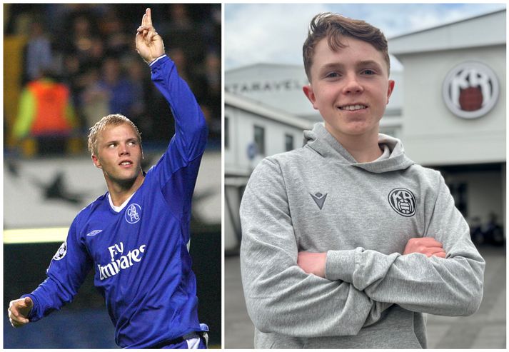 Fimmtán ára KR-ingur tók metið af Eiði Smára: Fær hæfileikana frá mömmu Ágúst Orri Arnarson skrifar 16. apríl 2025 07:33 Eiður Smári var fjórum mánuðum eldri en Sigurður Breki Kárason þegar hann lék sinn fyrsta leik í byrjunarliði í efstu deild. Getty/Francis Glibbery/Sigurjón Hinn fimmtán ára gamli Sigurður Breki Kárason er yngsti byrjunarliðsmaður í sögu efstu deildar en metið var áður í eigu Eiðs Smára Guðjohnsen, eins besta leikmanns Íslands frá upphafi. Óvænt ánægja að hans sögn. Hæfileikana fær hann frá móður sinni. Sigurður er fæddur í desember árið 2009. Fimmtán ára og 125 daga gamall þegar leikurinn fór fram á mánudag, rúmum fjórum mánuðum yngri en Eiður var þegar hann byrjaði sinn fyrsta leik. „Þetta er að sjálfsögðu mikill heiður og ég var ekki að búast við þessu… Ég var náttúrulega alveg stressaður fyrst, en svo þegar leið á og styttist í leikinn þá varð ég bara spenntur“ sagði Sigurður í viðtali sem var sýnt í Sportpakkanum í gærkvöldi og má sjá hér fyrir neðan. Sigurður stóð sig vel í leiknum, lék allar níutíu mínúturnar og var valinn maður leiksins af stuðningsmönnum KR. „Það var náttúrulega bara geggjuð tilfinning og gaman að byrja þetta svona.“ Fær hæfileikana frá mömmu Yfirleitt þegar svona ungir leikmenn skjótast skyndilega upp á stjörnuhimininn eru þeir íþróttaættaðir, af afreksfólki komnir. Sigurður sagði svo ekki vera, en þakkar móður sinni fyrir að erfa hann góðum eiginleikum. „Ég held að ég fái [hæfileikana] frá mömmu. Hún er með þyngdarpunktinn, sem er minn helsti styrkleiki.“ Sigurður mundar skotfótinn.vísir / guðmundur Sigurður leiðrétti síðan misskilning sem var á margra vörum eftir leikinn. Hann er ekki 155 sentimetrar á hæð, heldur 162 sentimetrar. Örlítið minni en Lionel Messi, en er auðvitað aðeins fimmtán ára og á eftir að stækka. „Já, ég á nóg inni“ sagði Sigurður, sem glímdi mikið við Hólmar Örn í leiknum, varnarmann Vals og vöðvabúnt sem er svona um það bil hundrað kíló. Var það ekkert erfitt? „Nei, ég spilaði bara minn leik og lét það ekkert trufla mig.“ Viðtalið í heild sinni má sjá í spilaranum að ofan. Næsti leikur KR er gegn KÁ í bikarnum. Liðið heimsækir síðan FH næsta miðvikudag. Eiður Smári Guðjohnsen og Sigurður Breki Kárason.Getty Besta deild karla KR Mest lesið Sjáðu geggjaðan snúning Alberts áður en hann skoraði frábært mark Fótbolti Bunting dró orð sín til baka með tárin í augunum: „Ég er ekki meistari fólksins“ Sport Sakaður um svindl á HM í pílukasti Sport Áhorfendur ærðust eftir mögulega mark mótsins í fyrsta leik Fótbolti Klappstýrur Björgvins Karls slógu í gegn Sport Óskar Hrafn um komu Arnórs Ingva: „Gífurlega dýrmætt fyrir KR“ Íslenski boltinn Ótrúleg tíðindi á HM í pílukasti: „Mikið sjokk“ Sport Freyr himinlifandi með íslensku strákana Fótbolti „Ef þið væruð Antoine Semenyo, hvert mynduð þið fara?“ Enski boltinn Óttast að Isak hafi fótbrotnað Enski boltinn Fleiri fréttir Óskar Hrafn um komu Arnórs Ingva: „Gífurlega dýrmætt fyrir KR“ Arnór Ingvi orðinn leikmaður KR Breiðablik kaupir Jónatan frá Norrköping Elías mættur til meistaranna KR sagt vera að landa Arnóri Ingva Hilmar Árni til starfa hjá KR Segir fjórðung í bók Óla ósannan Víkingur í úrslit Bose-bikarsins eftir sigur „Verið heiður að spila í appelsínugulu með frábærum liðsfélögum“ Þekkir Egilshöllina vel og skoraði gegn fyrrum félögum Strákar Heimis Guðjóns fengu slæman skell í fyrsta leik Axel verður áfram hjá Aftureldingu Kveður pabba sinn í Laugardalnum og fer til FH „Félag sem var í basli með að ná endum saman og greiða laun á réttum tíma“ Skrýtið og taktlaust: „Ég er ekkert sátt með niðurstöðuna“ Fanndís kveður sviðið: „Ég er búin að fella nokkur tár“ Gylfi með tvö og Víkingar byrja á sigri Frá Akureyri til Danmerkur Markadrottningin heldur að landsliðið sé búið spil Strákarnir í 2. flokki Vals þeir einu sem ekki spila fyrir áramót Dæturnar vildu norður: „Mun alltaf gera allt fyrir þær“ Stjarnan sækir markvörð í 3. deildina „Ég var orðinn algjörlega bugaður“ Jónatan áfram á Hlíðarenda: „Var alltaf jákvæður fyrir því að framlengja“ Óli Jó kallar ráðninguna á Jóa Kalla algjört bull „Ég elska þig Ísland, takk fyrir allt!“ Sextán ára með fernu fyrir meistara Víkings Valur dregur sig úr Bose-bikarnum „Sagði bara við hann: Djöfulsins fíflið þitt“ Yngir upp í allt of gamalli deild Sjá meira