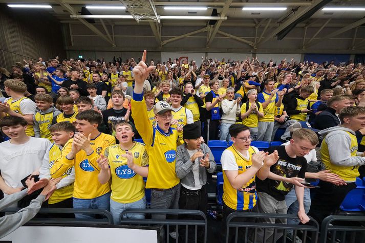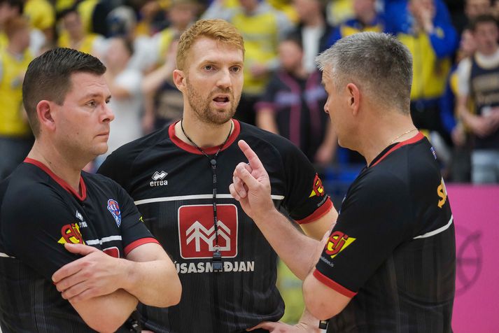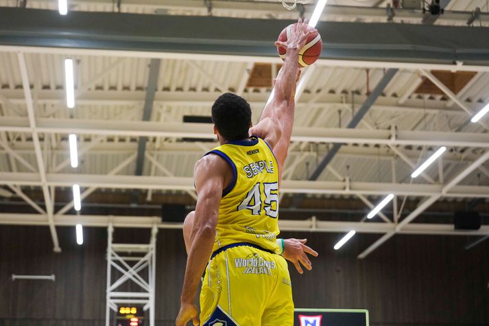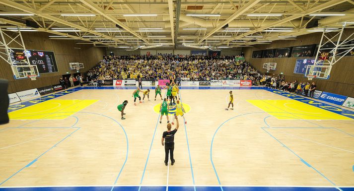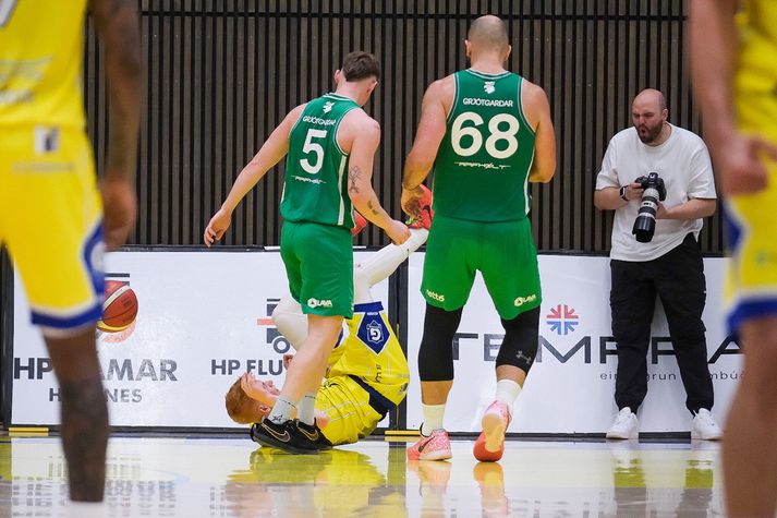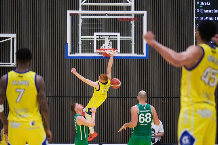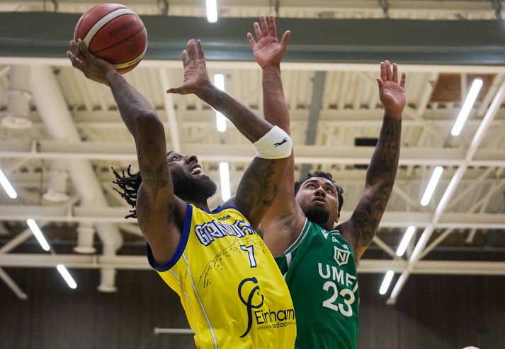 Grindavík vann Njarðvík, 109-96, í fyrsta heimaleik sínum í tæp tvö ár. Grindvíkingar voru mun sterkari aðilinn í seinni hálfleik. Það var búið að stilla upp fyrir veislu í HS Orku-höllinni í kvöld. Grindvíkingar voru að spila fyrsta alvöru heimaleik sinn í 694 daga og hvorki stuðningsmenn þeirra né Njarðvíkur létu sig vanta á þann stóra viðburð. Húsið var troðfullt og stemmningin eftir því. Fyrri hálfleikur var jafn og spennandi. Njarðvíkingar náðu frumkvæðinu í fyrsta leikhluta og bæði lið voru að spila vel sóknarlega. Forysta gestanna varð mest níu stig en Grindavíkingar minnkuðu muninn í eitt stig í stöðunni 49-48 þegar Arnór Tristan Helgason tróð í hraðaupphlaupi. Það var reyndar það síðasta sem hann gerði í leiknum því hann lenti hræðilega eftir troðsluna, fékk þungt höfuðhögg og fólk hreinlega tók andköf í höllinni. Hann var leiddur af velli en kom ekki meira við sögu. Arnór Tristan hafði spilað frábærlega fram að þessu og eftir leik virtist hann í ágætu standi miðað við höggið mikla. Arnór Tristan Helgason sést hér troða en lenti afar illa í kjölfarið.Vísir/Anton Arnór Tristan lendir hér í gólfinu eftir troðsluna og líkt og sést hjá ljósmyndaranum undir körfunni þá brá fólki illilega sem fylgdist með.Vísir/Anton Staðan í hálfleik var 54-51 fyrir heimamenn eftir þriggja stiga körfu Ólafs Ólafssonar undir lok hálfleiksins og hún gaf heldur betur tóninn fyrir seinni hálfleik. Því í þriðja leikhluta tóku Grindvíkingar öll völd. Í stöðunni 59-58 náðu Grindvíkingar 26-9 kafla og gengu frá leiknum. Þeir náðu þessum týpíska Grindavíkurleik, þriggja stiga skotin duttu og stúkan fylgdi með. Fjórði leikhlutinn varð í raun aldrei spennandi þrátt fyrir að Njarðvíkingar hafi minnkað muninn undir lokin. Munurinn fór niður í tólf stig en tíminn var of naumur til að það dygði til. Mario Matosovic sýndi fína spretti í kvöld.Vísir/Anton Lokatölur 109-96 og Grindavík fagnar því sigri eftir þennan fyrsta leik í HS Orku-höllinni í tæp tvö ár. Atvik leiksins Byltan sem Arnór Tristan fékk var svakaleg og það mátti sjá angistarsvip á öllum í húsinu í kjölfarið. Sem betur fer virðist hann í lagi og Grindvíkingar stigu vel upp í fjarveru hans en Arnór Tristan var kominn með 11 stig þegar þarna var komið við sögu. DeAndre Kane átti fínan leik fyrir Grindavík og sækir hér á Dwayne Lautier.Vísir/Anton Tvær þriggja stiga körfur frá DeAndre Kane og Ólafi Ólafssyni undir loka þriðja leikhluta voru risastórar. Þær kveiktu í stúkunni og gerðu stúkuna mjög erfiða fyrir gestina. Stjörnur og skúrkar Jordan Semple var mjög góður í fyrsta leik sínum fyrir Grindavík. Hann skoraði 28 stig, tók 11 fráköst og gaf 5 stoðsendingar. 39 framlagsstig samtals sem er afar gott. DeAndre Kane og Ólafur skiluðu sínu og Khalil Shabazz var góður með 16 stig og 11 stoðsendingar. Jordan Semple ver hér skot frá Dominykas Milka.Vísir/Anton Hjá Njarðvík var Mario Matosovic frábær í fyrri hálfleik en það fjaraði undan leik hans í þeim síðari. Dwayne Lautier var stigahæstur gestanna með 23 stig og nýi Bandaríkjamaðurinn Brandon Averette átti ágæta spretti. Dómararnir Heilt yfir komust þeir vel frá leiknum. Það var hiti í húsinu og á tímabili virtist sem hitinn inni á vellinum yrði aðeins of mikill en þríeykið Kristinn Óskarsson, Bjarki Þór Davíðsson og Ingi Björn Jónsson voru með ágæt tök á öllu saman. Dómaratríóið ræðir málinVísir/Anton Stemmning og umgjörð Í hæsta klassa. Eins og Jóhann Þór þjálfari Grindavíkur sagði eftir leik þá var líkt og um væri að ræða leik í oddaleik í undanúrslitum fremur en fyrsta leik tímabilsins. Stinningskaldi var í miklu stuði í kvöld enda komnir heim til Grindavíkur.Vísir/Anton Stúkan var troðfull og umgjörð heimamanna til fyrirmyndar með hoppukastala og grillveislu fyrir leik. Njarðvíkingar voru fjölmennir í stúkunni sömuleiðis og stuðningsmenn beggja liða duglegir að hvetja sín lið. Veigar Páll Alexandersson reynir að skora en Ólafur Ólafsson er mættur í vörninni.Vísir/Anton Viðtöl