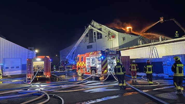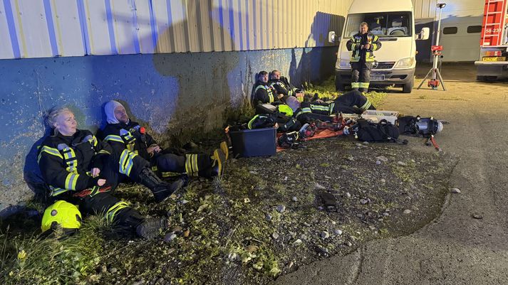 Slökkvistarf stóð yfir í þrettán klukkutíma Elín Margrét Böðvarsdóttir skrifar 16. október 2025 06:50 Mikill eldur kom upp í iðnaðarhúsnæði á Siglufirði fyrr í vikunni. Slökkvilið Fjallabyggðar Slökkvistarf tók í allt um þrettán klukkustundir eftir að eldur kom upp í iðnaðarhúsnæði á Siglufirði síðastliðið mánudagskvöld. Þá tók við bruna- og öryggisvakt og hefur slökkviliðið í Fjallabyggð nokkrum sinnum þurft að fara og slökkva í glóð og eldhreiðrum eftir brunann. Þetta kemur fram í færslu frá Slökkviliðinu í Fjallabyggð á Facebook seint í gærkvöldi. Mikill eldur kom upp í húsnæði fyrirtækisins Primex á Siglufirði á mánudagskvöldið og stóð slökkvistarf yfir alla nóttina og áfram á þriðjudaginn. Sjá einnig: „Mjög slæmt og erfitt að horfa upp á svona“ Ljóst varð strax í upphafi að slökkvilið ætti umfangsmikið og erfitt verk fyrir höndum. „Mikill eldur var í húsinu þegar að var komið og sjáanlegur á þriðju hæð hússins. Ákveðið var strax í upphafi að kalla eftir aðstoð frá Slökkviliði Dalvíkurbyggðar og Slökkviliði Akureyrar. Slökkvilið fékk upplýsingar strax í upphafi að enginn væri í húsinu. Umrætt húsnæði er stórt og flókið og var ákveðið að allt slökkvistarf færi fram utandyra og var enginn reykkafari sendur inn í húsnæðið,“ segir í færslu slökkviliðsins. Slökkviliðsmenn hvíla lúin bein á vettvangi.Slökkvilið Fjallabyggðar „Til allrar mildi var hagstæð vindátt og hlýtt þegar eldurinn kom upp. Mikinn reyk lagði frá eldsvoðanum og fór hann allur á haf út en ekki inn í þéttbýlið á Siglufirði. Svona verkefni verða aldrei leyst nema með góðri samvinnu allra aðila,“ segir ennfremur. Sérstakar þakkir færir Slökkviliðið í Fjallabyggð Slökkvili Dalvíkur, Slökkvili Akureyrar, Brunavörnum Skagafjarðar, Lögreglunni á Norðurlandi eystra, Björgunarsveitinni Strákum, Björgunarskipinu Sigurvin, Slysavarnadeildinni Vörn á Siglufirði, sjúkraflutningamönnum HSN á Siglufirði, Þjónustumiðstöð Fjallabyggðar, BÁS og Rarik fyrir veitta aðstoð við slökkvistörf. „Þá vill slökkviliðsstjóri færa starfsmönnum, eigendum og aðstandendum þess fyrirtækis sem var með starfsemi í húsinu kærar þakkir fyrir mikilvæga aðstoð á vettvangi á erfiðum tíma,“ segir loks í færslunni. Þak húsnæðisins þar sem fyrirtækið Primex er með starfsemi stóð í ljósum logum.Slökkvilið Fjallabyggðar Fjallabyggð Slökkvilið Mest lesið Leikskólagjöld einstæðra foreldra í Reykjavík gætu allt að þrefaldast Innlent Minnst ellefu hundar drepist við Geirsnef: „Áfall að sjá dýrið sitt hlaupa í dauðann“ Innlent Heimilar banatilræði í Venesúela og íhugar árás Erlent Ítarlegar frásagnir af kynnum við „Andy“ í nýrri bók Giuffre Erlent Þingmenn misvel klæddir þegar þeir voru reknir út Innlent Fjöldi komst ekki út og brann lifandi Erlent Segir Indverja ætla að hætta að kaupa olíu af Rússum Erlent Meintur brennuvargur í haldi lögreglu Innlent Slökkvistarf stóð yfir í þrettán klukkutíma Innlent Við gætum farið að aka Sundabraut eftir sjö ár Innlent Fleiri fréttir Umboðsmaður snuprar stjórnvöld Einn vistaður vegna slagsmála ungmenna í Breiðholti Leggjast gegn hlutfallslækkun stuðnings við einkarekna fjölmiðla Slökkvistarf stóð yfir í þrettán klukkutíma Leikskólagjöld einstæðra foreldra í Reykjavík gætu allt að þrefaldast Minnst ellefu hundar drepist við Geirsnef: „Áfall að sjá dýrið sitt hlaupa í dauðann“ Við gætum farið að aka Sundabraut eftir sjö ár Þingmenn misvel klæddir þegar þeir voru reknir út Meintur brennuvargur í haldi lögreglu Réðst með hnífi á fanga á Litla-Hrauni Norrænir bankar skoði hvort breyta þurfi skilmálum vegna dómsins Fimmtíu ný störf í Bláskógabyggð vegna nýs baðlóns Lífeyrissjóðs-, bíla- og neytendalán gætu líka reynst ólögleg Segir óvirðingu að kalla Ljósið „samtök úti í bæ“ Áhrif vaxtamálsins, útlit Sundabrautar og þingmenn á hlaupum Vill að Þórunn tilnefni Trump til friðarverðlauna Nóbels Sóttur sex sinnum á sjúkrabíl og slökkviliðið stefnir vegna skuldar Greip inn í þegar aldraður faðir hans keypti bíl handa vinkonu sinni Gummi Emil sver af sér ásakanir um dýraníð: „Ég bað hestinn afsökunar“ Biðtíminn sé dauðans alvara sem auki álag ofan í áfallið Álag á bráðamóttöku og fólk beðið um að leita annað Sigríður Andersen nýr þingflokksformaður Miðflokksins Karlmaður í haldi vegna gruns um brot gegn barni í Hafnarfirði Bankinn hefur samband ef hann skuldar þér pening Mál leiðbeinandans á Múlaborg á leið til héraðssaksóknara „Það er allt svart þarna inni“ Ekki láglaunakvenna að axla ábyrgð á innleiðingu kynjajafnréttis Íslandsbanki ætlar að hafa frumkvæði að endurgreiðslu til kúnna Lést samstundis þegar ekið var á hana á 143 kílómetra hraða Vilja þjóðfund um menntamál og framtíð landsins Sjá meira