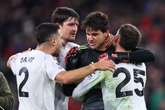 United komst í 1-0 snemma leiks með marki Bryan Mbeumo. Mac Allister lá þá óvígur á grasinu eftir árekstur við liðsfélaga sinn, Virgil van Dijk. Mac Allister þurfti svo að klára leikinn með eins konar sundhettu á höfðinu, eftir skurðinn sem hann fékk, og Slot segir ljóst að dómarinn hefði átt að stöðva leikinn vegna meiðslanna. Ummæli hans á blaðamannafundi má sjá hér að neðan. „Við hefðum átt að gera mun betur eftir að Macca var kominn í grasið. En heilsa leikmanna er mikilvæg og ef það þarf að sauma fjögur spor í leikmann þá auðvitað vonast maður til þess að allir skilji að það þarf strax að hlúa að honum. Það gerðist ekki,“ segir Slot og bætir við: „En ég ítreka að við hefðum getað gert betur og þetta er ekki ástæðan fyrir því að við töpuðum í dag. Ástæðan er sú að það voru allt of mörg færi sem við nýttum ekki.“ Mörkin úr 2-1 sigri United, og þar á meðal þegar Mac Allister meiðist, má sjá hér að neðan. Slot er vel meðvitaður um að stundum þykjast leikmenn hafa meitt sig í höfðinu, til að nýta sér það að dómurum er uppálagt að stöðva leik þegar um höfuðmeiðsli er að ræða. Hvorki afsökun fyrir markinu né tapinu „Ég vona bara að allir skilji að við erum ekki svona lið, eins og ég sé mikið um í fótbolta, þar sem menn þykjast hafa meitt sig í höfðinu til að stöðva skyndisókn. Þannig erum við ekki. Við leggjumst aldrei niður og erum alltaf heiðarlegir. Svo ef að okkar leikmaður fer niður þá myndi maður vona að allir hugsi: Þetta er Liverpool, þeir gera ekki svona lagað, blásum í flautuna. En ég endurtek að þetta er ekki afsökun fyrir því að við skyldum fá á okkur mark og ekki afsökun fyrir því að við töpuðum,“ segir Slot.