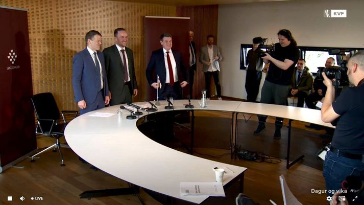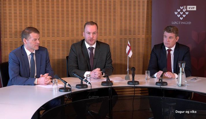 Ný landsstjórn boðar óbreytt ríkjasamband við Danmörku Kristján Már Unnarsson skrifar 9. apríl 2026 11:51 Beinir Johannesen, formaður Fólkaflokksins og nýr lögmaður, kynnir stjórnarsáttmálann. Hann er aðeins 29 ára gamall og yngsti lögmaður í sögu Færeyja. Kringvarpið Víðtækar pólitískar málamiðlanir voru nauðsynlegar, sagði Beinir Johannesen, nýr lögmaður Færeyja, á blaðamannafundi í Þórshöfn laust fyrir hádegi. Þar kynntu formenn flokkanna þriggja, sem mynda nýja landsstjórn í Færeyjum, stjórnarsáttmálann sem ber fyrirsögnina „Ábyrgð, stöðugleiki og breið samstaða“. Auk embættis lögmanns fer Fólkaflokkurinn með atvinnumál, samgöngur, innflytjendamál og menntamál í landsstjórninni. Bárður á Steig Nielsen, formaður Sambandsflokksins, verður utanríkis- og sjávarútvegsráðherra. Einnig fer flokkur hans með heilbrigðismál sem og orku- og umhverfismál. Aksel V. Johannesen, formaður Javnaðarflokksins og fráfarandi lögmaður, verður fjármálaráðherra í nýju stjórninni. Flokkur hans fær einnig félagsmálaráðuneytið, en þar undir eru meðal annars jafnréttis- og vinnumarkaðsmál. Formenn Fólkaflokksins, Sambandsflokksins og Javnaðarflokksins kynntu stjórnarsáttmálann í beinni útsendingu Kringvarpsins úr Lögþinginu. Frá vinstri: Bárður á Steig Nielsen, Beinir Johannesen og Aksel V. Johannesen, en Beinir er bróðursonur Aksels.Kringvarpið Aðild Sambandsflokksins að landsstjórninni þýðir að ríkjasambandið við Danmörku verður að mestu óbreytt enda er það höfuðstefnumál flokksins. Landsstjórnin hyggst þó taka upp viðræður við ríkisstjórn Danmerkur um að Færeyingum verði tryggður sjálfsákvörðunarréttur í öllum málum sem varða Færeyjar. Utanríkismál eru þar sérstaklega nefnd en í stjórnarsáttmála segir að núverandi rammi veiti Færeyingum ekki nauðsynleg völd í utanríkismálum til að geta gætt eigin hagsmuna gagnvart umheiminum. Flokksformennirnir kampakátir eftir að hafa kynnt stjórnarsáttmálann á blaðamannafundinum.Kringvarpið „Við verðum að vera þar sem ákvarðanirnar eru teknar. Þess vegna munum við semja við dönsku ríkisstjórnina um að fá aðild að alþjóðastofnunum; þar á meðal með því að gera eða ganga til alþjóðasamninga, svo sem fríverslunar- og tvísköttunarsamninga.“ Nefnt er að kannaður verði möguleiki á aðild að EFTA, en einnig að útflutningsmarkaðir verði styrktir með fríverslunarsamningi við Evrópusambandið og fleiri lönd. Færeyjar Danmörk Kosningar í Færeyjum Tengdar fréttir Samstaða um að Beinir verði lögmaður Færeyja Samkomulag hefur náðst um myndun nýrrar þriggja flokka landsstjórnar í Færeyjum milli Fólkaflokksins, Sambandsflokksins og Javnaðarflokksins. Beinir Johannesen, formaður Fólkaflokksins, staðfesti í viðtali við Kringvarpið í dag að hann myndi leiða stjórnina og verða næsti lögmaður Færeyja. 8. apríl 2026 19:45 Fólkaflokkurinn fram úr Javnaðarflokknum Fólkaflokkurinn er að bæta verulega við sig fylgi í kosningunum sem fóru fram í Færeyjum í dag. Javnaðarflokkurinn, sem var sá stærsti, missir hins vegar töluvert fylgi og endar með þriðja stærsta þingflokkinn á Lögþingi Færeyja. Framsókn og Tjóðveldi, sem voru með Javnaðarflokknum í ríkisstjórn, missa einnig fylgi en þó lítið. 26. mars 2026 23:52 Mest lesið Björgvin Halldórsson látinn Innlent Strandaglópar á Tenerife eftir að hafa verið meinaður aðgangur að flugi Innlent Gabríel Douane játaði óvænt að hafa barið fangaverðina Innlent Kollegar furðu lostnir og gagnrýna uppsögn Ragnars Innlent Ragnari Frey býðst hærra starfshlutfall á Landspítalanum Innlent Ragnari Frey sagt upp störfum á Landspítala Innlent Segist ekki hafa fengið boð um hærra starfshlutfall Innlent Flæddi út um leka lögn á meðan fólk flúði vegna vatnsskorts Innlent „Ketamín-drottningin“ í fimmtán ára fangelsi Erlent Krefst þess að Íranir uppfylli „hið raunverulega samkomulag“ Erlent Fleiri fréttir Bretar hvattir til að taka íslenskan þorsk fram yfir breskan Ný landsstjórn boðar óbreytt ríkjasamband við Danmörku Fylgdust með rússneskum kafbátum við sæstreng í Norðursjó Fundaði með Trump eftir harða gagnrýni á NATO Krefst þess að Íranir uppfylli „hið raunverulega samkomulag“ Líbanon verið hluti af samkomulaginu og Trump þurfi að velja „Ketamín-drottningin“ í fimmtán ára fangelsi Samstaða um að Beinir verði lögmaður Færeyja Hormússund sagt lokað á ný Rex Heuermann játar að hafa myrt átta konur Gagnrýna tvískinnung Vance í Ungverjalandi Réðust fyrirvaralaust á miðborg Beirút Bauð Pútín að vera „músin“ hans Almenn ánægja með vopnahléið og vonir um endalok átaka Bein útsending: Artemis II á leiðinni heim Vance sakar ESB um kosningaafskipti á kosningafundi með Orbán Bandaríkin og Íran komist að samkomulagi um vopnahlé Hótar að útrýma írönsku þjóðinni Leikskólabarn lést eftir að það var kramið í koju Hvað er „sveitó“?: Spænskir stjórnmálaleiðtogar deila um Guernica Artemis II er á heimleið JD Vance heimsækir Orban fyrir kosningarnar um helgina Íranska þjóðin vöruð við því að nota lestar landsins í dag Íranska þjóðin fagni sprengjuregni Tillögum að vopnahléssamkomulagi komið til stríðandi fylkinga Tveir létust í snjóflóði í Hemsedal Fjær að heiman en nokkur maður frá upphafi Orbán sakaður um sprengjutilræði Yfirmaður leyniþjónustunnar felldur Féll fyrir borð í Norðursjó í ofsaveðri Sjá meira